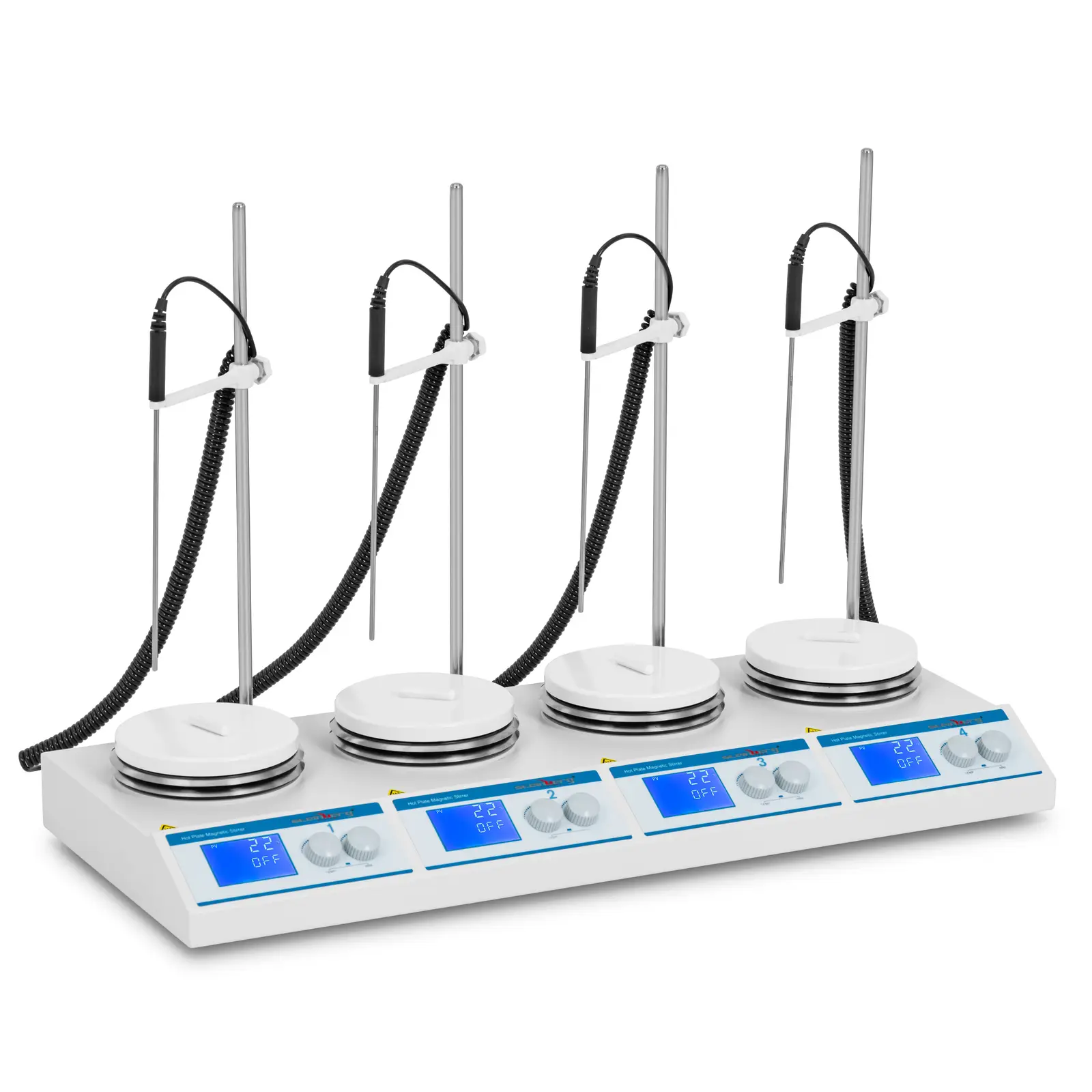 Se estiver a misturar muitos produtos químicos diferentes ou outros líquidos no laboratório, o agitador magnético da Steinberg Systems será a ferramenta certa para si. Possui quatro placas de aquecimento que podem ser utilizadas independentemente para mexer e aquecer. Cada estação tem dois botões de controlo e um ecrã LCD. Desta forma, tem sempre todos os valores à vista. Com o seu motor sem escovas, isento de manutenção, e uma dissipação de calor eficiente, o misturador destaca-se pelo seu funcionamento fiável durante um longo período de tempo. Isto torna o modelo adequado para uma vasta gama de aplicações em laboratórios de várias indústrias, bem como na investigação.